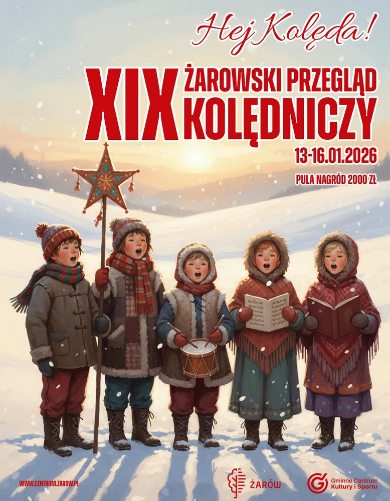Gminne Centrum Kultury i Sportu w Żarowie serdecznie zaprasza do udziału w XIX Żarowskim Przeglądzie Kolędniczym, który odbędzie się w dniach 13 - 16 stycznia 2026 roku.