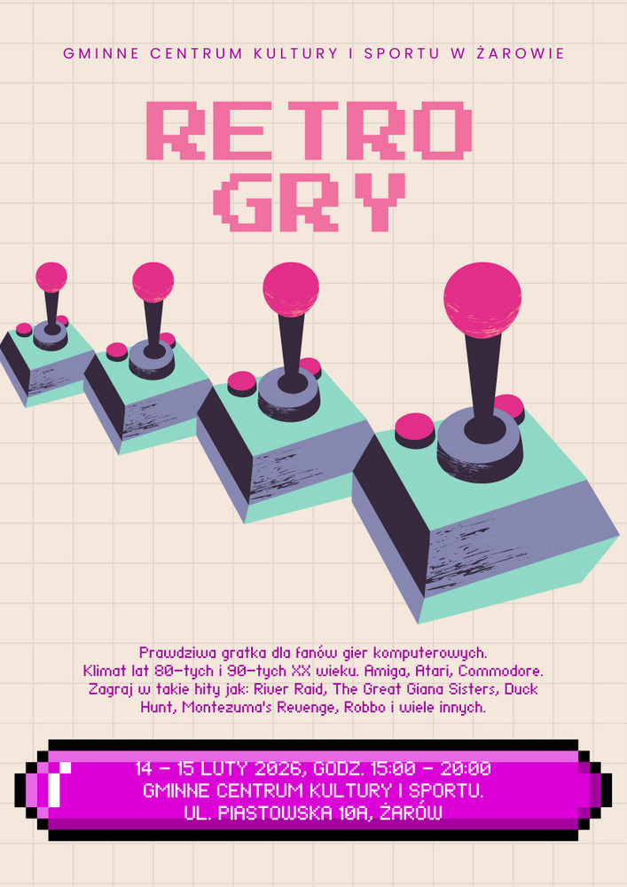 14 – 15 luty, godzina 15:00 – 20:00, Retro Gry w Gminnym Centrum Kultury i Sportu w Żarowie, sala kameralna. Prawdziwa gratka dla fanów gier komputerowych. Klimat lat 80-tych i 90-tych XX wieku. Amiga, Atari, Commodore, Sega. Zagraj w takie hity jak: River Ride, Giana Sisters, Duck Hunt, Montezuma, Robo i wiele innych. Wstęp wolny.
