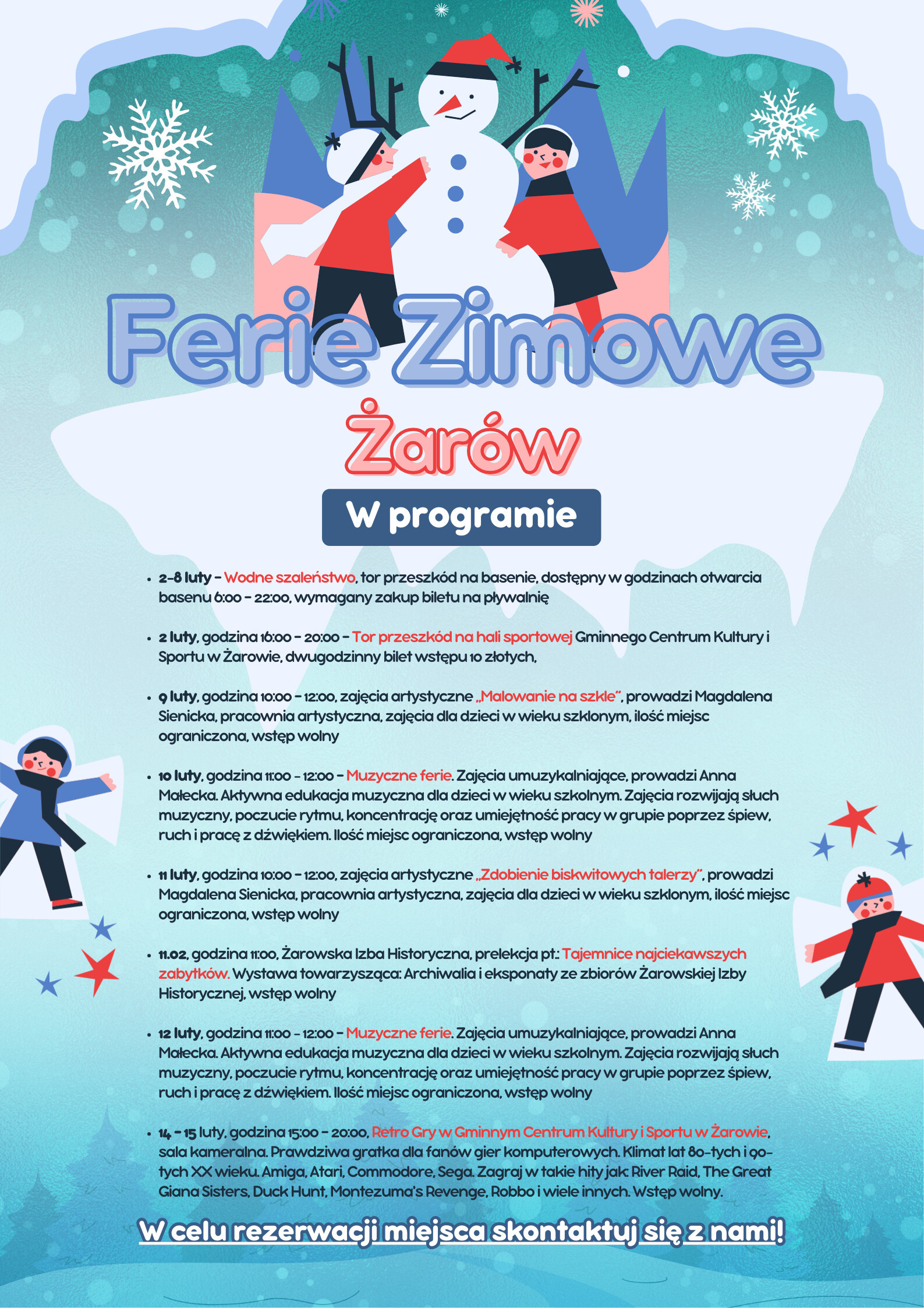 10 luty, godzina 11:00 - 12:00 – Muzyczne ferie. Zajęcia umuzykalniające, prowadzi Anna Małecka. Aktywna edukacja muzyczna dla dzieci w wieku szkolnym. Zajęcia rozwijają słuch muzyczny, poczucie rytmu, koncentrację oraz umiejętność pracy w grupie poprzez śpiew, ruch i pracę z dźwiękiem. Ilość miejsc ograniczona, wstęp wolny